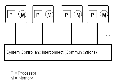The PGHPF compiler targets an SPMD programming model. In the SPMD model, each processor executes the same program, but operates on different data. This is implemented by loading the same program image into each processor. Each processor then allocates and operates on its own local portion of distributed arrays, according to the distributions, array sizes and number of processors as determined at runtime. Special attention is required to address the unique communication characteristics of many parallel systems. The PGHPF Runtime library handles HPF data distribution tasks in a generic manner so that HPF programs will work on distributed memory and shared memory systems (some parallel systems use shared memory others use distributed memory, there are also hybrid systems. Lower levels of the PGHPF runtime library are customized for different parallel architectures). Figure 5-1, "Distributed Memory Parallel System", shows a conceptual view of a parallel system running an HPF program.