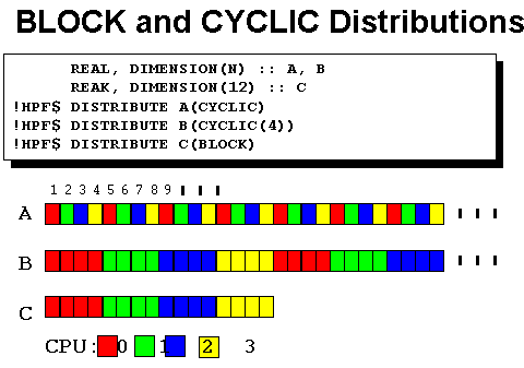 The next example is very similar, but uses a CYCLIC distribution. A cyclic distribution divides data among processors in a round-robin fashion. A block distribution divides data into evenly distributed chunks (as evenly as possible) over the available processors. A cyclic distribution divides data over processors so that each processor gets one element from each group of n elements, where n is the number of processors.