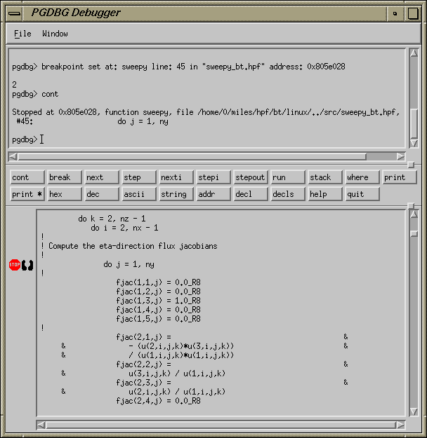 The PGDBG X-Windows Graphical User Interface (GUI) is invoked on UNIX systems using the command Xpgdbg, which runs as a separate process that communicates with pgdbg. This section describes how to use the GUI on systems where it's supported. There may be minor variations in the GUI from host to host, depending on the type of monitor available, the settings for various defaults and the window manager used. The basic interface across all systems remains the same with the exception of the differences tied to the display characteristics and the window manager used.
